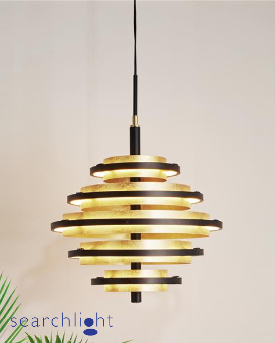 Beautifully detailed, the Hive LED 5 light pendant has 3 painted gold leaf black edged discs on a matt black metal base. Add this striking and distinctive design to a hallway, living room or bedroom of a modern living space. Available as part of a family with table and floor lamp.