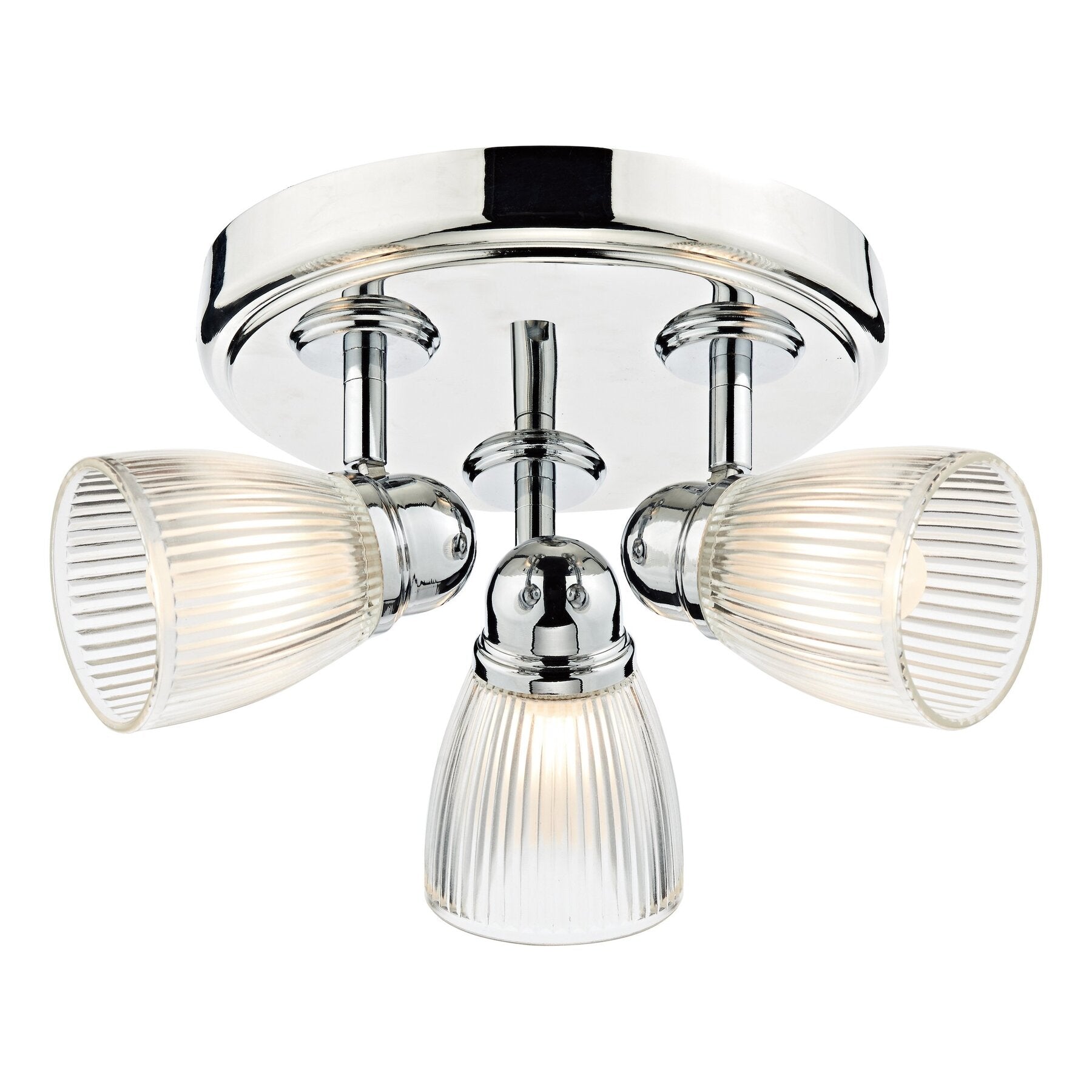 The CEDRIC bathroom flush spotlight in polished chrome finish with ribbed glass shades. Specifically designed to be safe for bathroom use in zones 1 and 2. The adjustable heads allow the light to be angled in specific areas of the room.