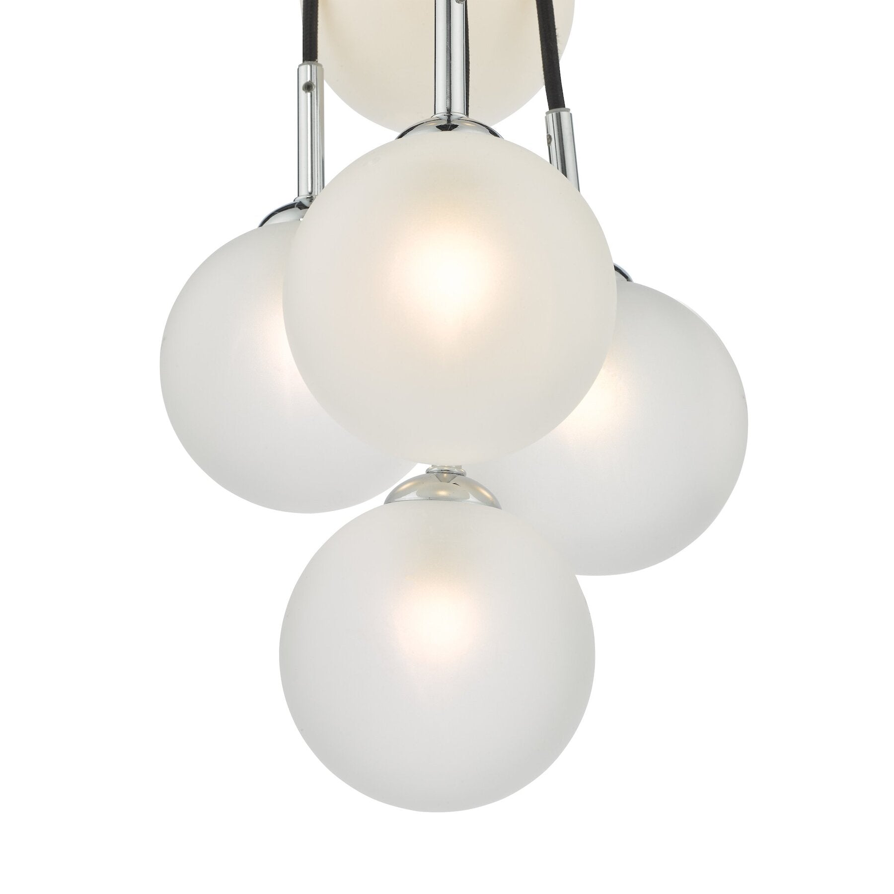 A seven light cluster pendant with polished chrome ceiling plate, black fabric cables and opal glass shades. The Elpis cluster pendant can be hung with the glass all at the same level creating a bunching effect, or can be adjusted with the help of your electrician to have the glass at different levels for a different look.