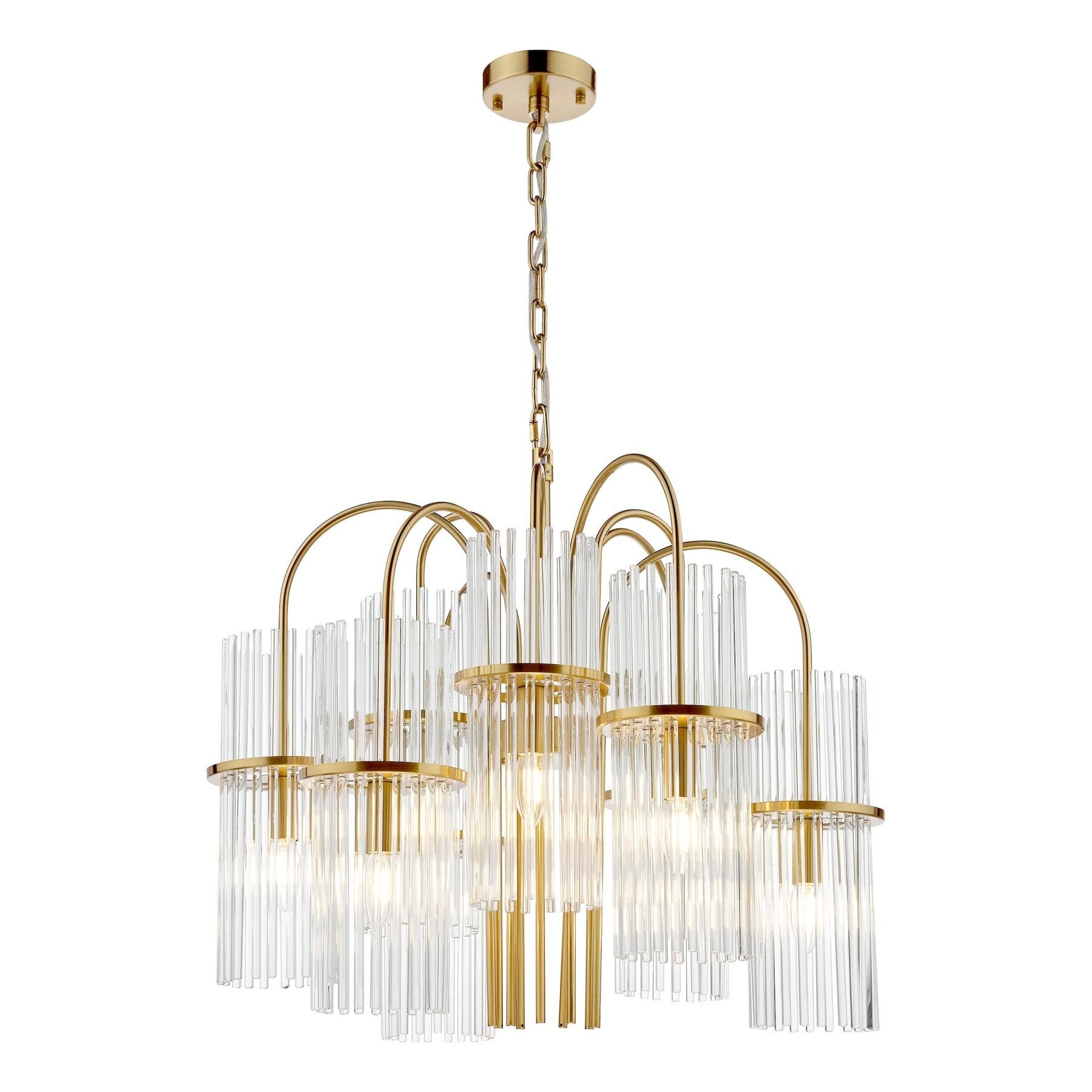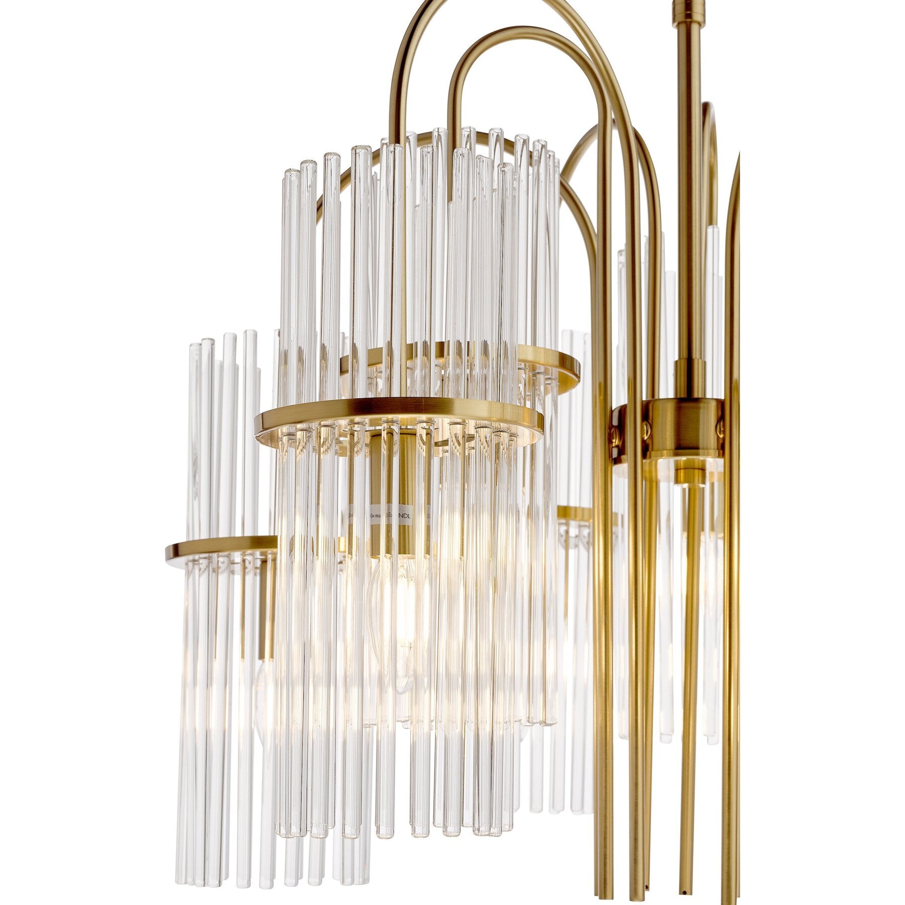 The Eniola 9 Light Chandelier is a stunning lighting fixture that adds elegance and charm to any home decor. With its nine individual pendant lights, this fixture creates a beautiful cascading effect, illuminating the space with a warm and inviting glow. The natural brass finish gives it a timeless appeal, while the glass shades, comprised of individual glass rods, add a touch of sophistication.