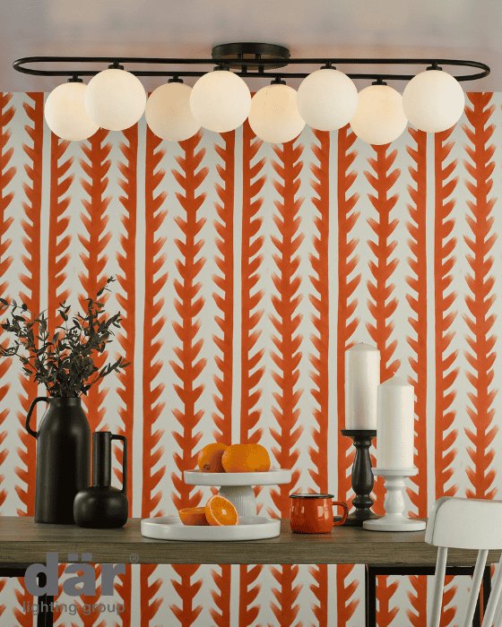 Illuminate your space with contemporary flair using the Luana 8 light semi-flush light from dar lighting. This striking fixture boasts a sleek matt black finish complemented by oversized opal glass shades, perfect for adding a touch of modern elegance to any room. Ideal for low ceiling light solutions, the Luana's semi-flush design hugs close to the ceiling whilst still making a statement. Its linear arrangement and huge light output make it a superb choice for galley kitchens or long hallways. Whether you're after a stylish kitchen light or a bold centrepiece for your living area, this versatile fixture delivers both form and function.