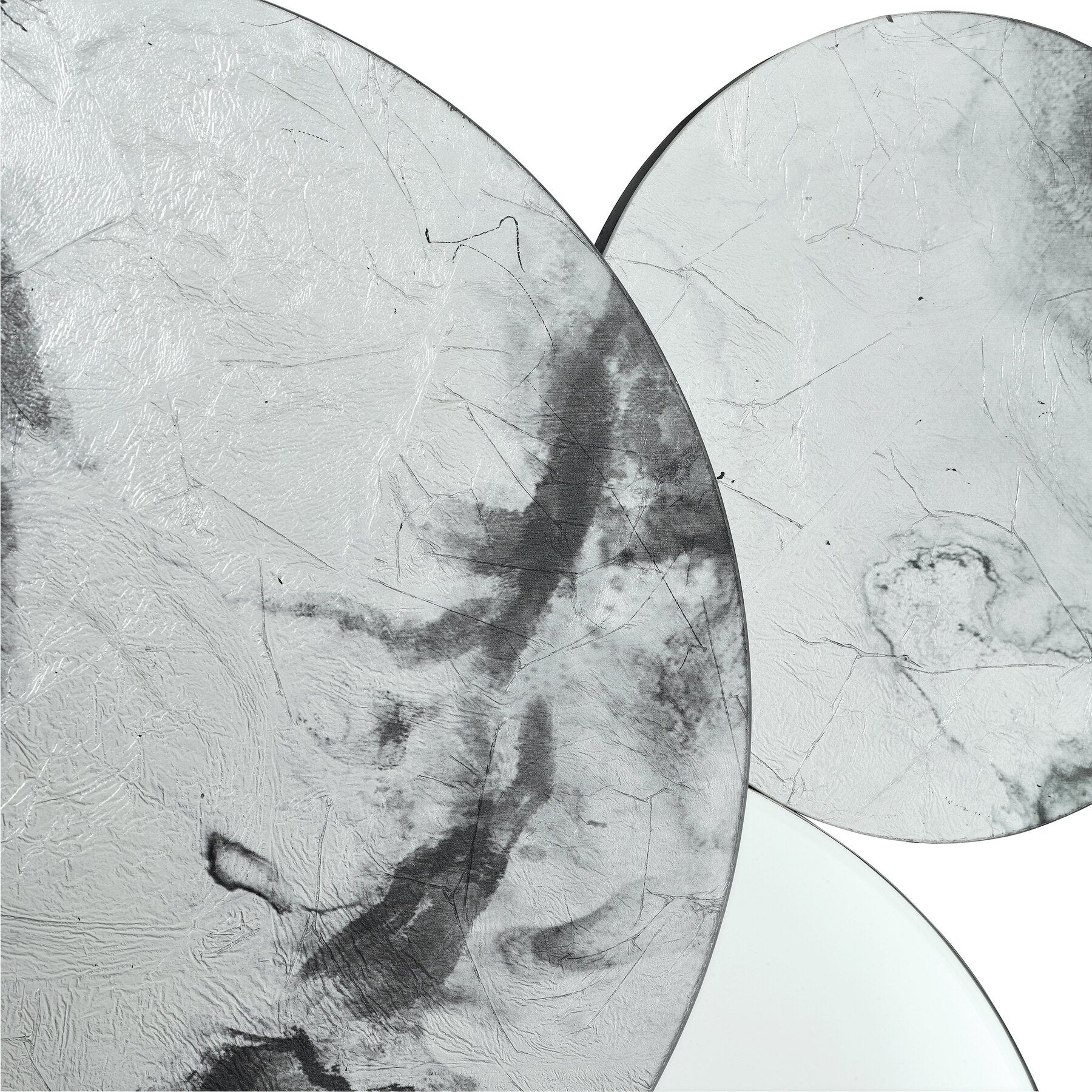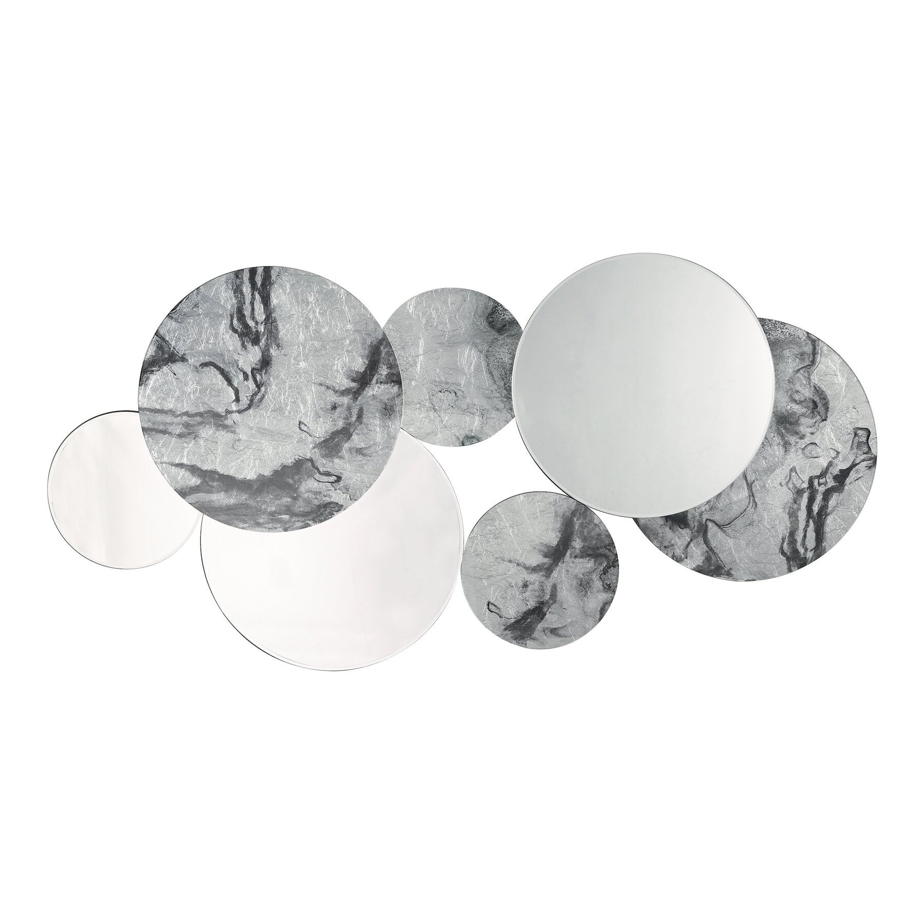 The elegant MECO mirror showcases a cluster of round mirrors with marble-effect accents over silver leaf. This mirror is designed for horizontal mounting only. Please note, fixings are not included; use screws and wall plugs suitable for your wall's construction.