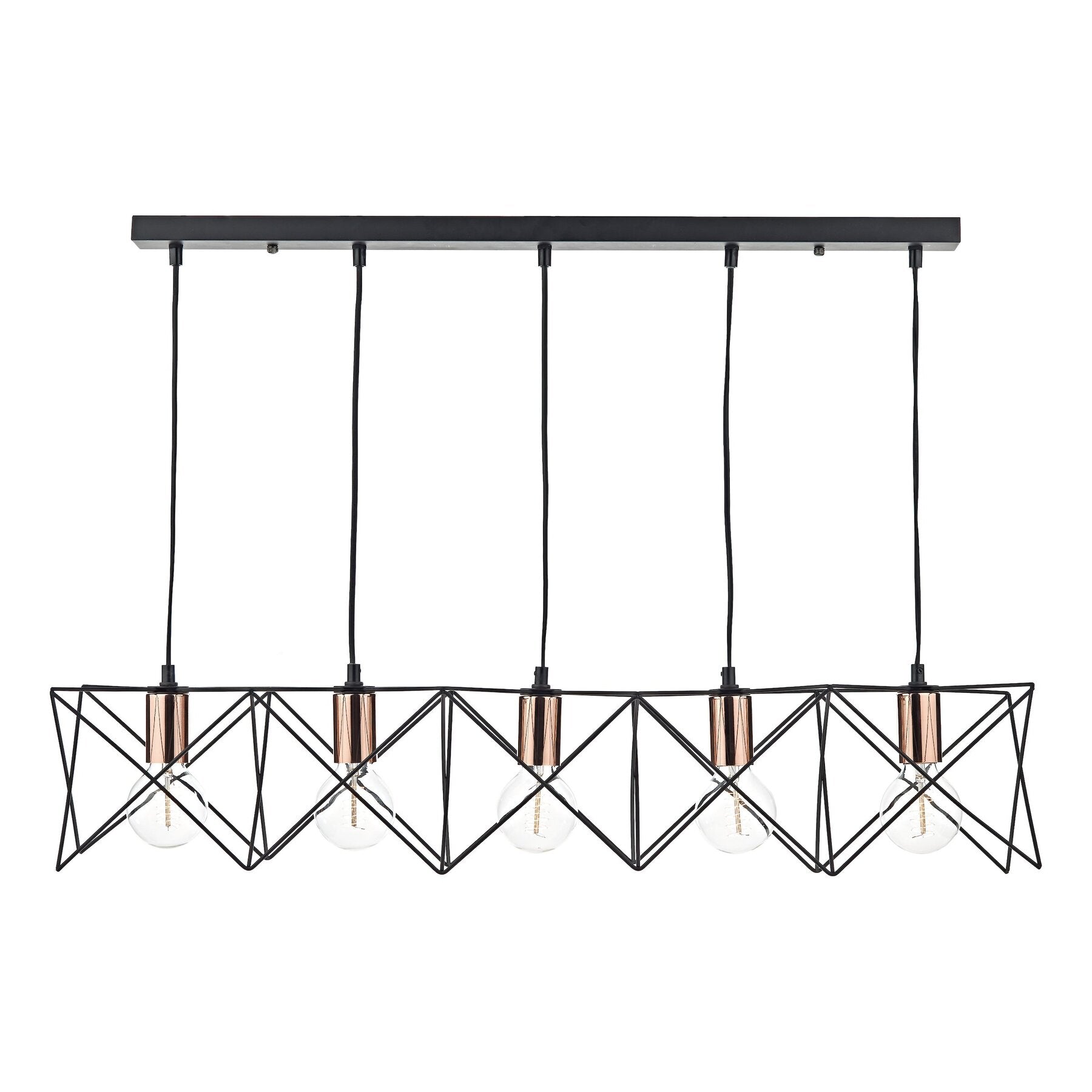 Longer than most island pendants, with 5 lights, the Midas bar pendant ceiling light from dar Lighting is a Scandi-style caged island light with a zig-zag, linear form, finished in matt black. The open framework neatly outlines and shows off the bright polished copper lampholders, and is perfect for displaying decorative bulbs. This fitting looks great in any living setting, such as over a sideboard, and is particularly marvellous when positioned above a kitchen island, bar or long table. Matching single pendant light available. Includes oblong matching ceiling rose and black cables. This bar pendant ceiling light is adjustable at point of installation to a minimum height of 28cm and a maximum height of 128cm. Bulbs not included; takes 5 x 40W max ES screw cap GLS standard.