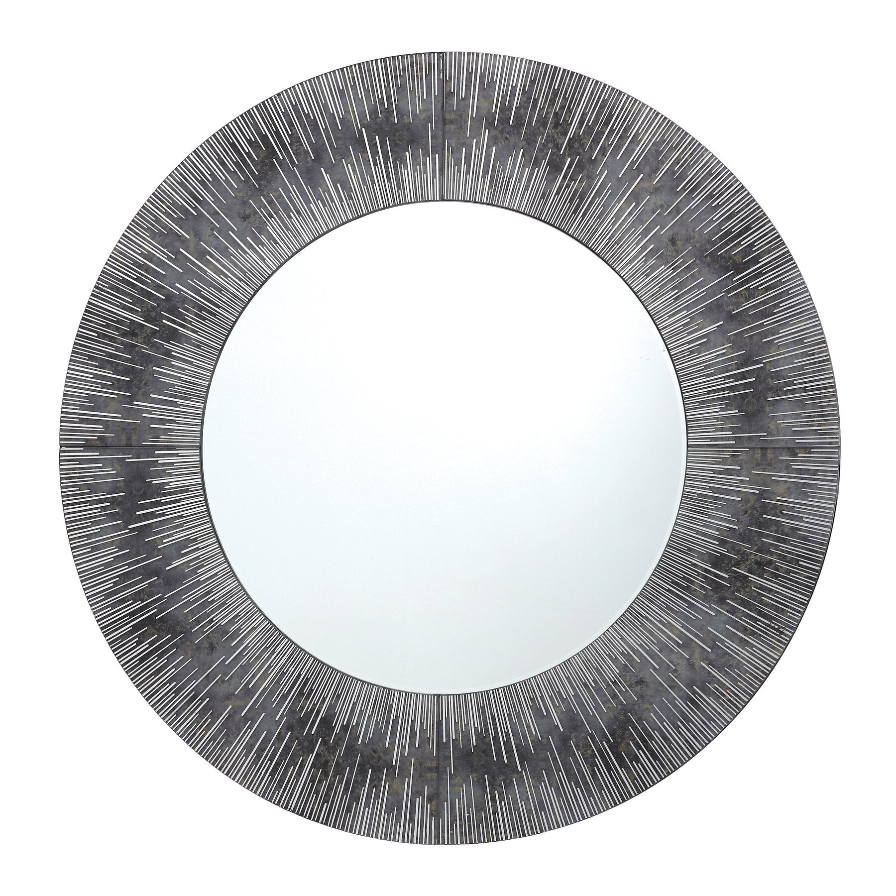 The striking Neome mirror from Dar Lighting showcases a purple and grey glass frame with intricate detailing, creating a captivating decorative effect. With its impressive 80cm diameter, it serves as a perfect stylish focal point for any living space.