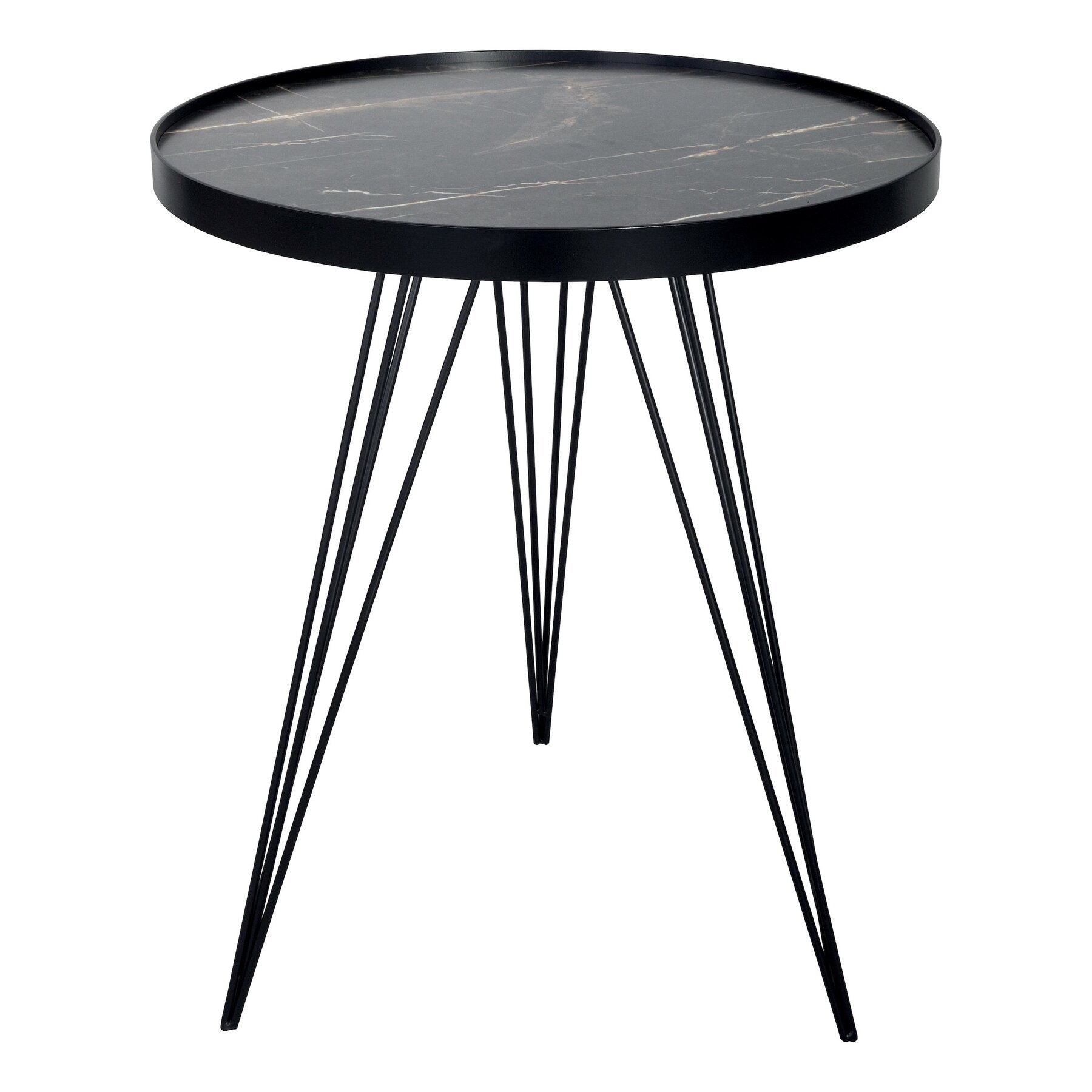 The RAUMA side table showcases a dark marble-effect top paired with mid-century-inspired black hairpin metal legs. Please note, some light assembly is required.