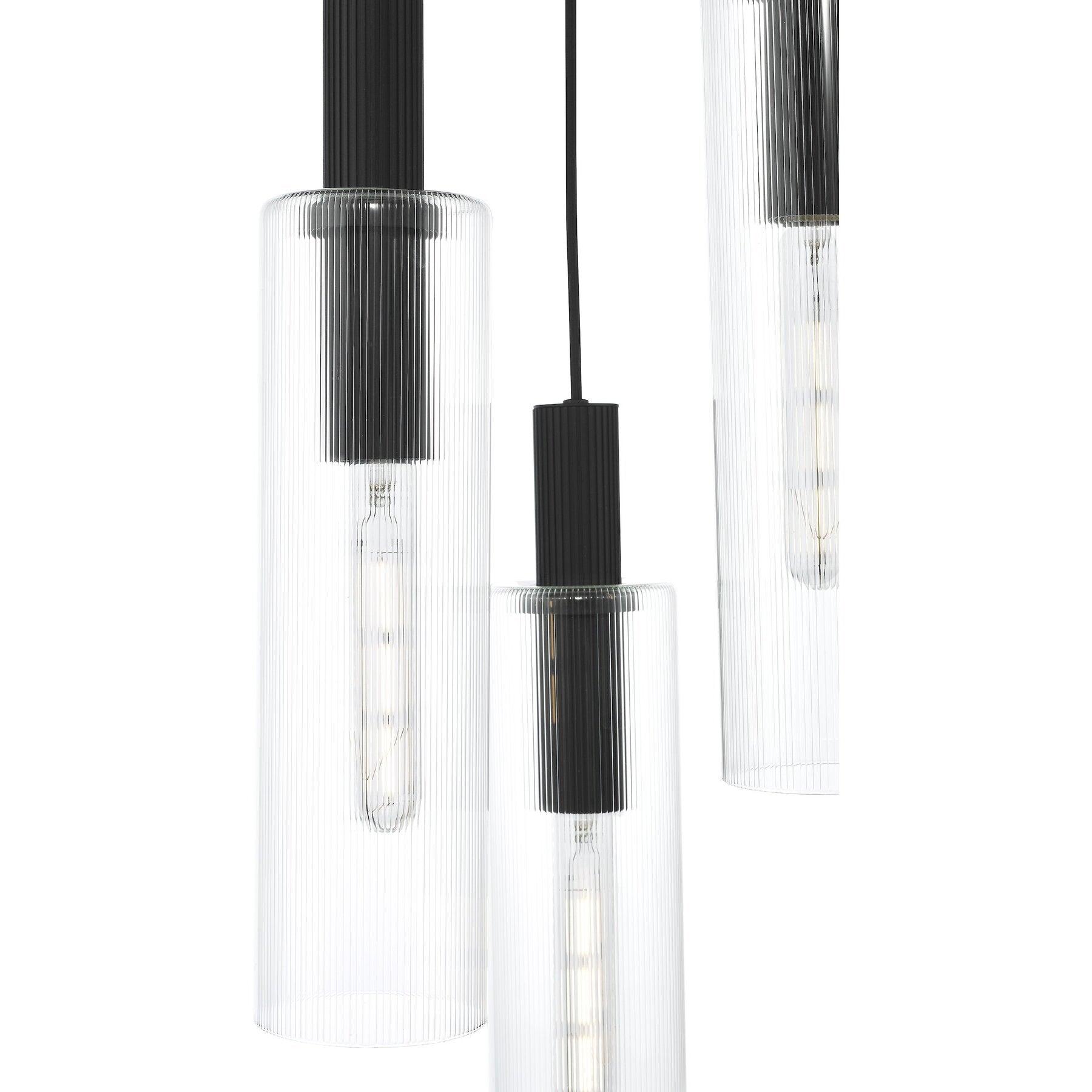 The Ruben 3 Light Cluster Pendant, a sleek and stylish lighting fixture designed to make a statement in your space. This pendant features a satin black finish and ribbed glass shades, which can be positioned at any height along the frame, adding a touch of modern functionality to any room. The Ruben 3 Light Cluster Pendant is perfect for illuminating larger areas such as stairwells. dining rooms or kitchen islands, providing ample light while adding a touch of modern elegance to your home. Whether you're hosting a dinner party or simply enjoying a meal with your family, this pendant will create a warm and inviting atmosphere.