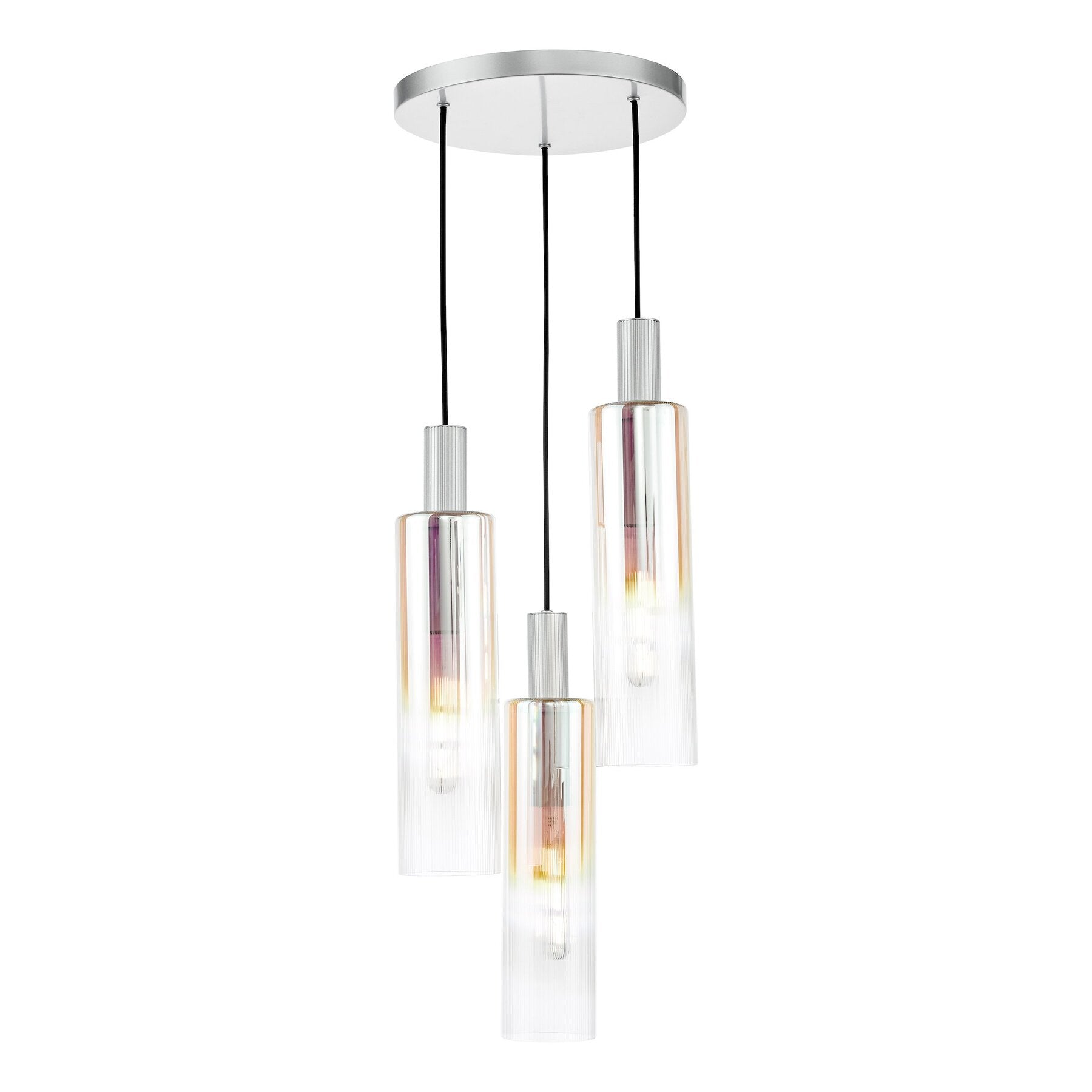 The Ruben 3 Light Cluster Pendant, a sleek and stylish lighting fixture designed to make a statement in your space. This pendant features a satin silver finish and ribbed iridised glass shades, which can be positioned at any height along the frame, adding a touch of modern functionality to any room. The Ruben 3 Light Cluster Pendant is perfect for illuminating larger areas such as stairwells. dining rooms or kitchen islands, providing ample light while adding a touch of modern elegance to your home. Whether you're hosting a dinner party or simply enjoying a meal with your family, this pendant will create a warm and inviting atmosphere.