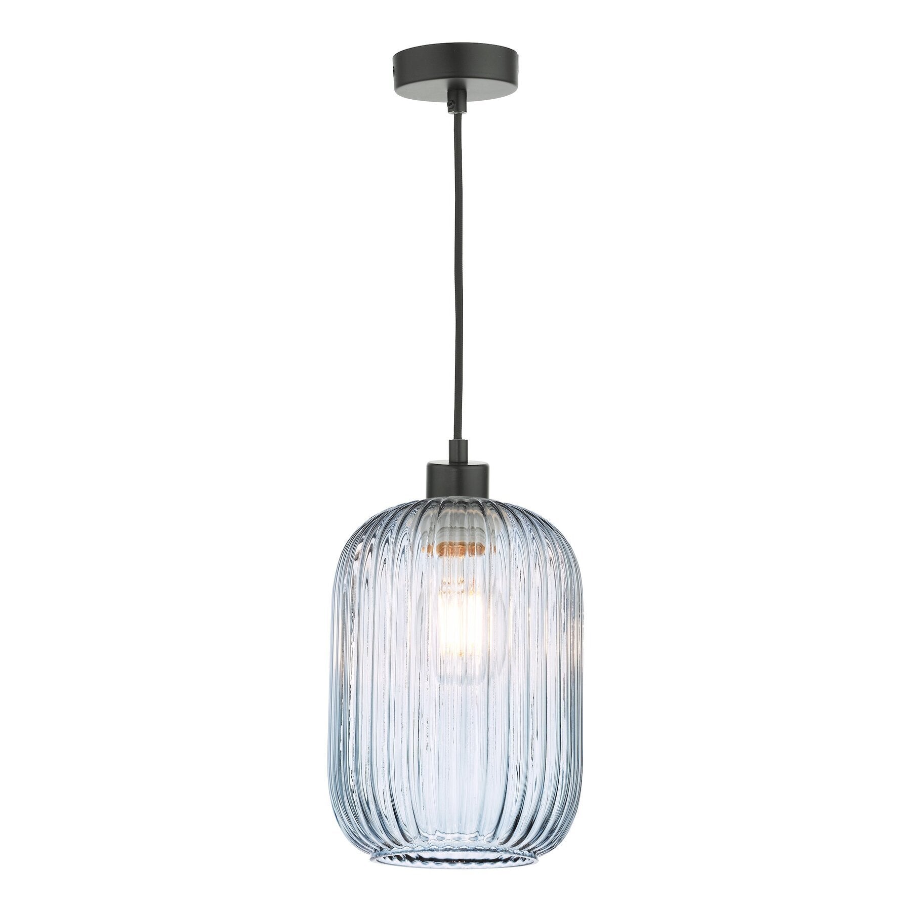 Dar Lighting Sawyer Matt Black & Blue Ribbed Glass Pendant