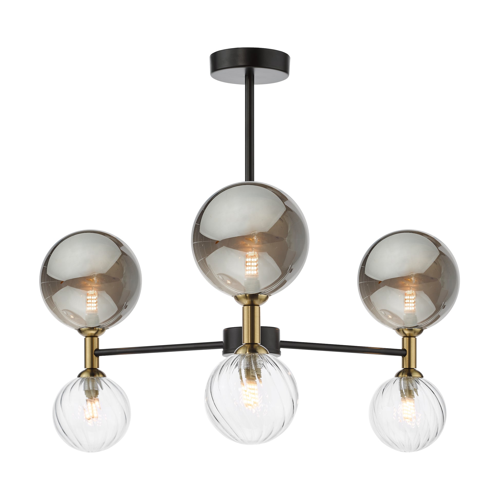 Illuminate your space with dar lighting's Takara, a chic solution for lighting for low ceilings. This 6-light semi-flush fixture marries matt black with moulded glass for a look that's both edgy and refined. Featuring a mix of small and large twisted, smoked glass shades, it casts a captivating glow both up and down.