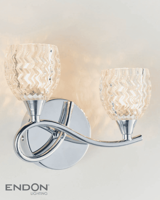 A twin wall light with curved chrome arms and cut‑glass shades. Dimmable and LED‑compatible, with matching items and additional colour options available.