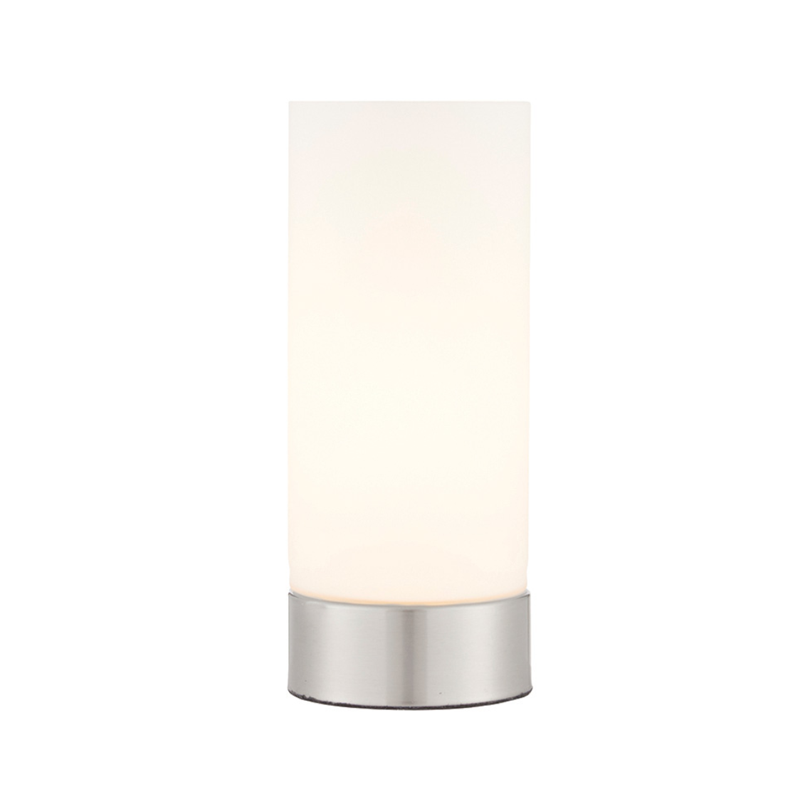 A brushed‑nickel dual‑purpose table lamp with a matt opal glass shade, featuring 3‑stage touch control and a discreet USB charging port.