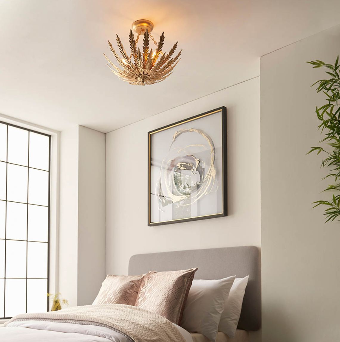 An opulent and ornate gold leaf finished floral semi flush light perfect for low ceilings. Decorative layered leaves create striking light patterns. This product is dimmable. Other family items available.