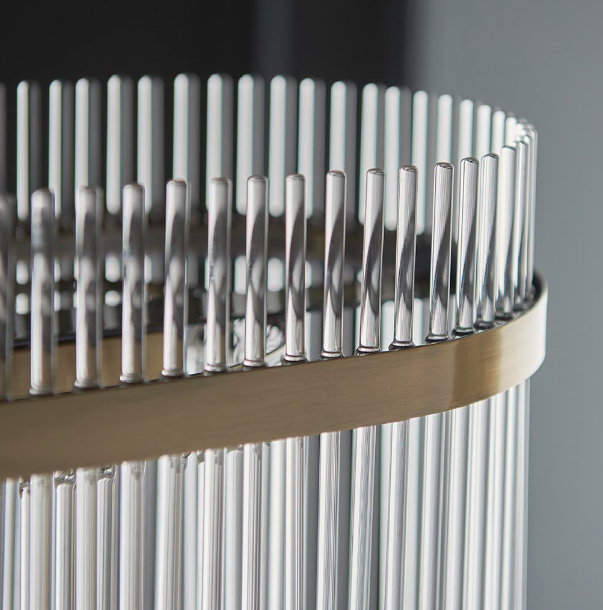 This linear 4 light pendant is perfect for adding a classic timeless look to dinning rooms. Finished in antique brass and decorated with clear glass rods that delicately diffuse the light, suspended from height adjustable chain, with clear flex.