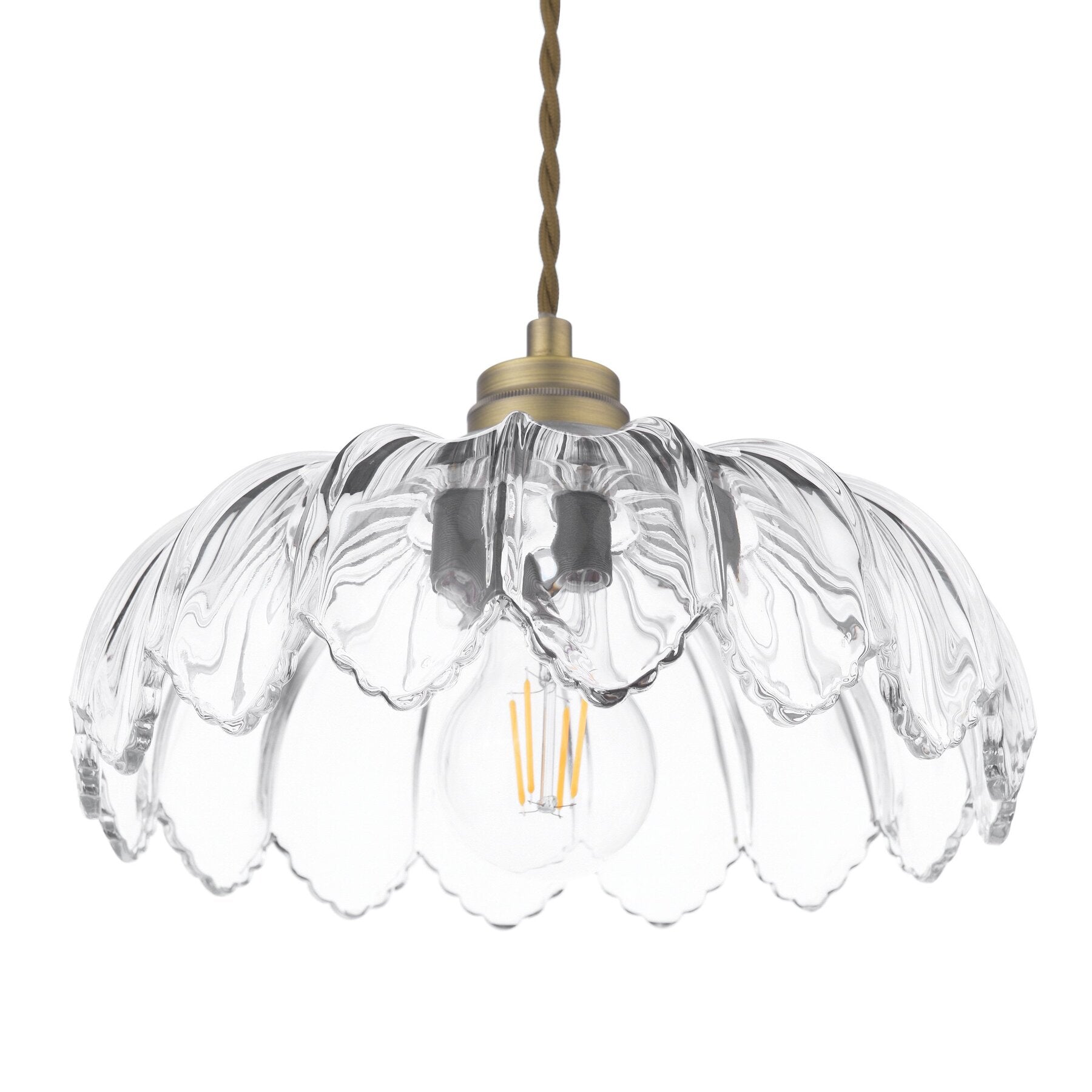 A timeless glass and antique brass pendant light featuring thick, clear fluted glass in a shallow dome with a scalloped edge. Suspended from a twisted cord and detailed ceiling rose, it provides wide illumination and showcases a visible feature bulb. Height adjustable on installation (24–120 cm).