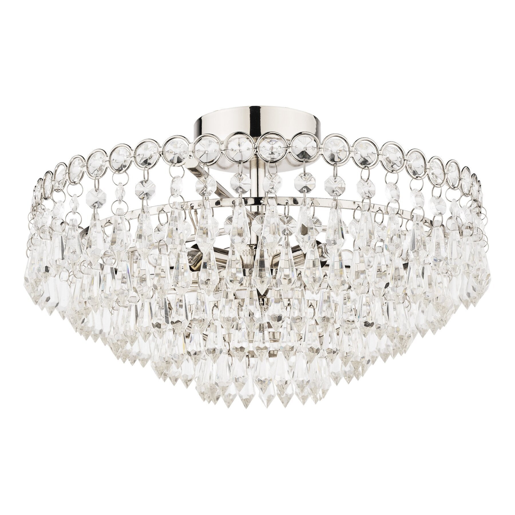 Elevate your space with timeless sophistication, introducing the Enid 5-Light Semi-Flush Ceiling Light by Laura Ashley. Inspired by classic French design, this striking centrepiece features a graceful cascade of hand-polished crystal beads that shimmer with every glance. The clear, cut crystals are suspended from a sleek metal frame in a polished nickel finish, adding a touch of opulence to any room. Designed to sit close to the ceiling with a discreet stem and no visible cables, this semi-flush fixture offers effortless elegance and enduring style.