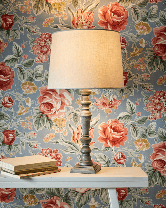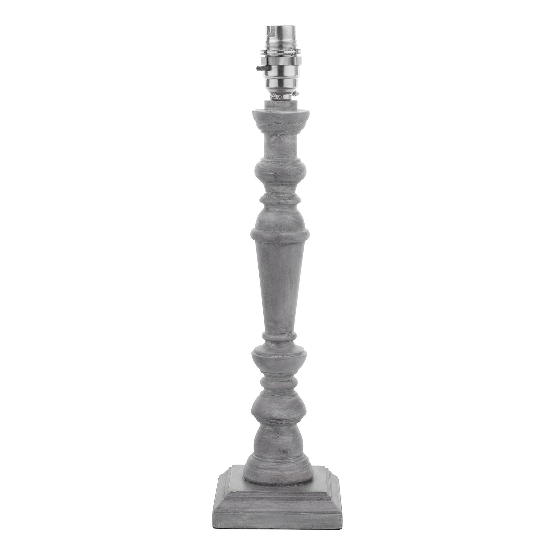 The Laura Ashley Tate Table Lamp showcases a hand-finished, distressed candlestick design. Crafted from turned wood with a square base, it comes in a soft washed grey finish.