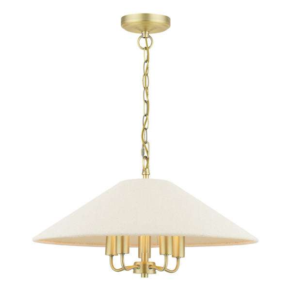 Its matt antique brass finish and five‑light design create a warm, inviting glow through the cream linen shade, offering a subtle touch of vintage‑inspired charm. Blending classic brass with soft linen, it suits both traditional and contemporary interiors, making it ideal for dining rooms and entryways. Comes complete with a natural linen coolie shade. Height adjustable at installation: 38.5–138.5 cm.