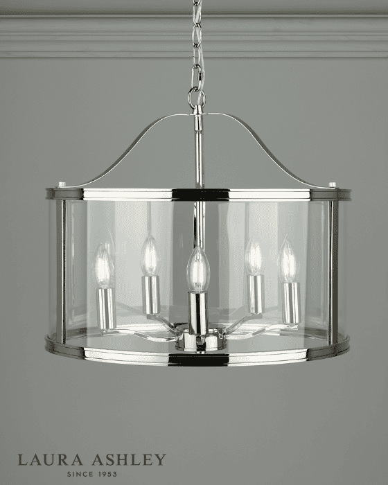 The Laura Ashley Harrington 5‑Light Ceiling Pendant combines clear glass with sleek vintage polished nickel in a clean, lantern‑style design. Its drum-shaped frame houses five suspended lampholders for an elegant, brightening effect in any room. Finished with a matching ceiling rose, chain, and discreet clear cable, the height can be adjusted on installation from 44–145cm.