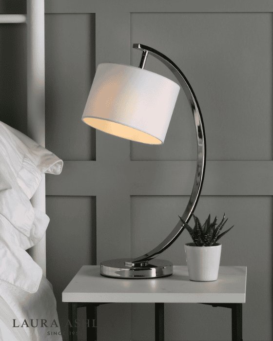 The Noah small table lamp from Laura Ashley features a white slubbed linen drum shade supported by a sleek curved ribbon stem on a round base, all finished in smooth brushed chrome for a clean, modern look.