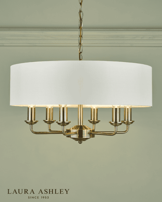 The Laura Ashley Sorrento 6-Light Ceiling Light combines subtle sophistication with contemporary style. Six lights sit within a sleek ivory silk-effect drum shade with a pearlescent inner, suspended from a stepped Art Deco–style ceiling rose in warm antique brass. Height adjustable up to 88 cm, it’s perfect for dining or living spaces.