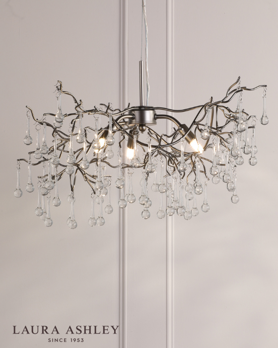 What's not to adore about this stunning willow chandelier, elegantly dripping with long crystal raindrops? Painted in a sophisticated pewter with a satin finish, the Willow pendant ceiling light from Laura Ashley is both bright and charming. This ceiling pendant includes a matching ceiling rose and hanging chain, along with a discreet clear cable. The height can be adjusted at the point of installation to fit your space perfectly (45-127cm). Please note, the bulbs are not included and it requires 3 x 33W max G9. It is dimmable when paired with suitable bulbs.