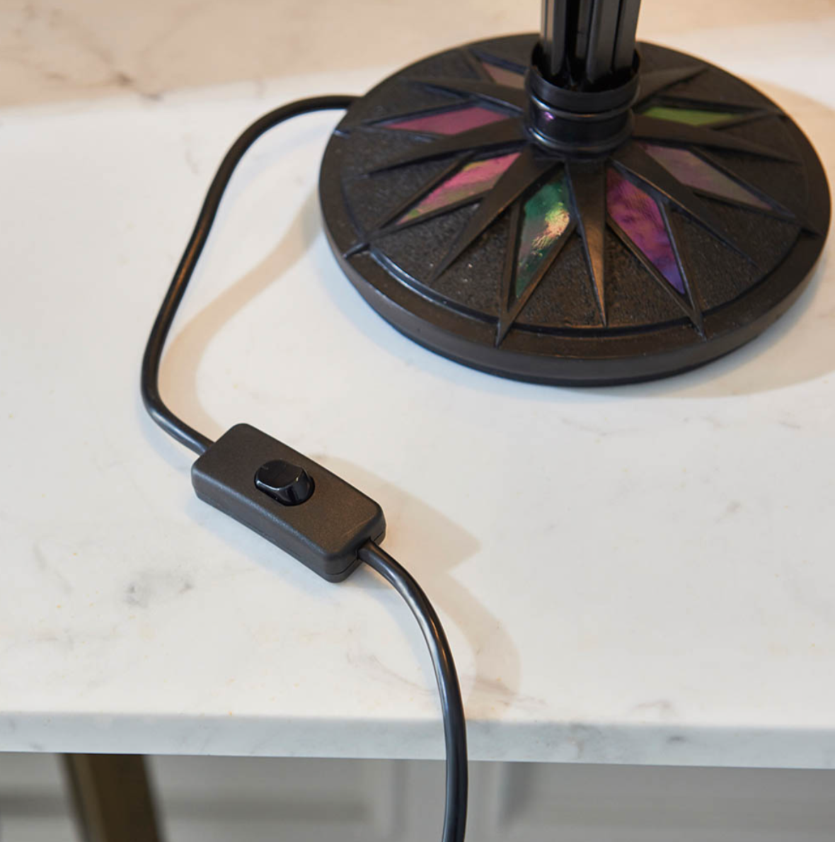 Hand crafted tiffany style glass shade with satin black die cast base with decorative inlaid glass