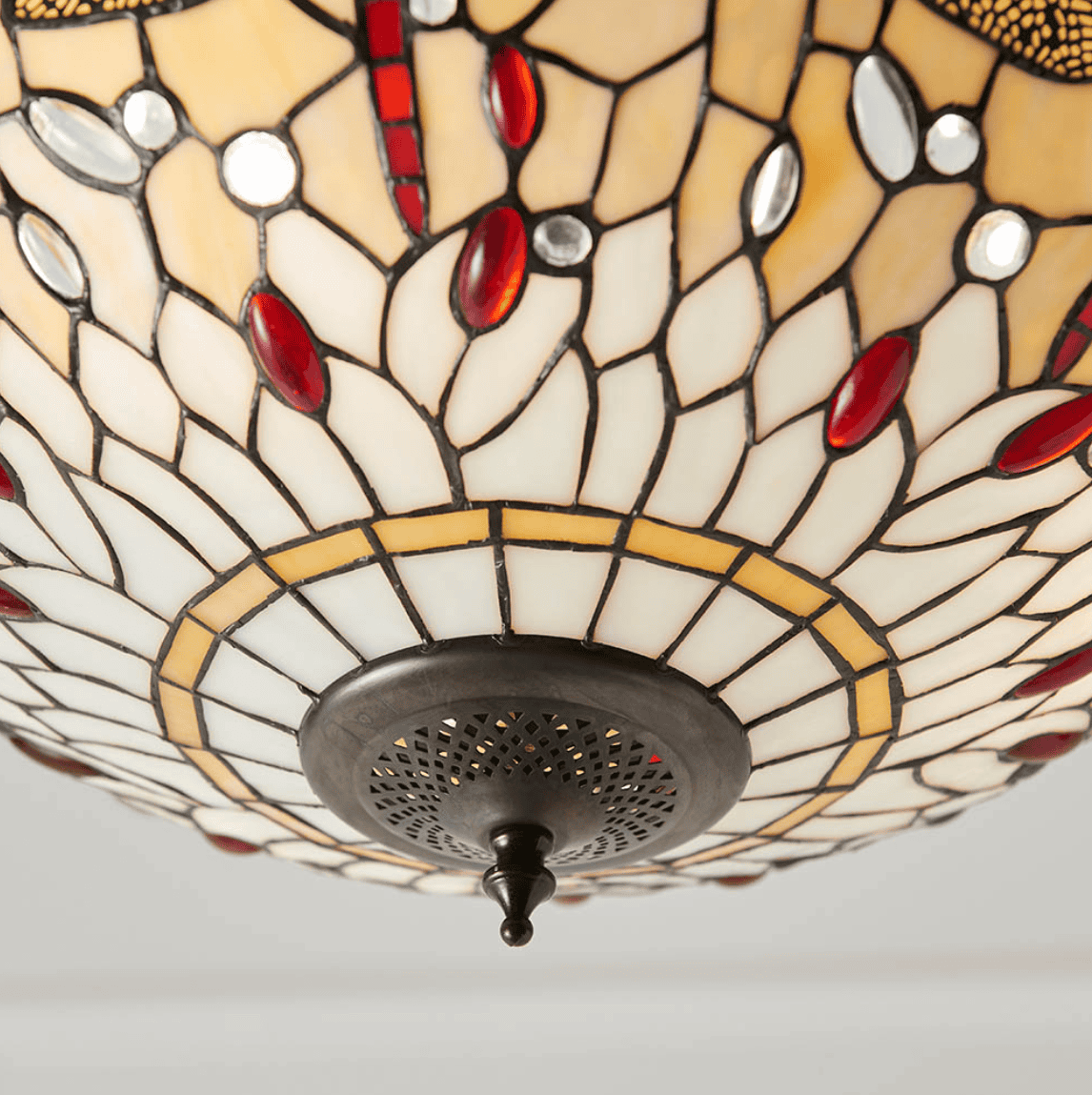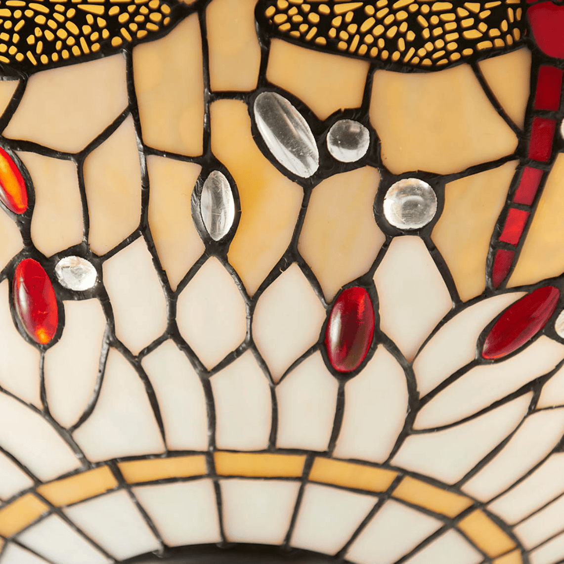 The medium inverted Dragonfly pendant in beige presents a timeless rendition of the iconic Tiffany Dragonfly design, featuring natural, muted tones enhanced by coloured glass beading. Complemented by a sleek satin black fitting, it is dimmable, compatible with LED lamps, and offers matching items to complete the ensemble.