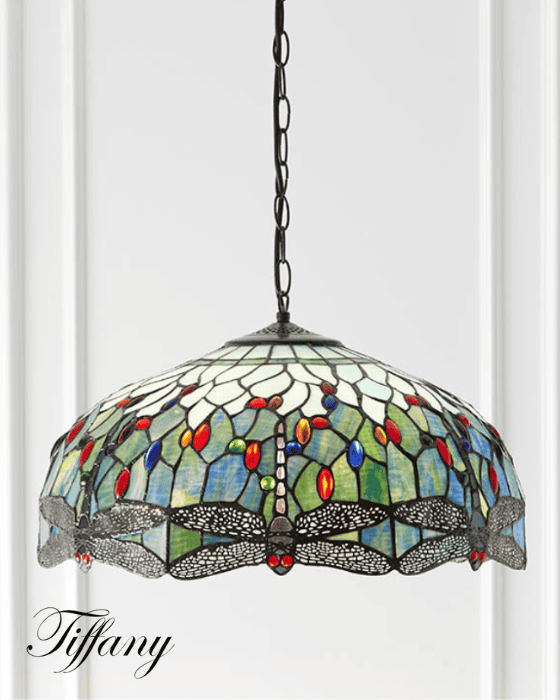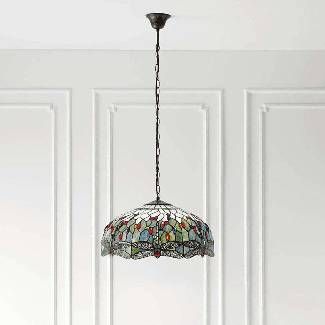 This striking large 3-light pendant features the iconic Tiffany Dragonfly design, showcasing vivid blue tones accented with multicolored glass beading. Complemented by a sleek satin black fitting, it is both dimmable and compatible with LED lamps, offering a perfect blend of elegance and functionality.