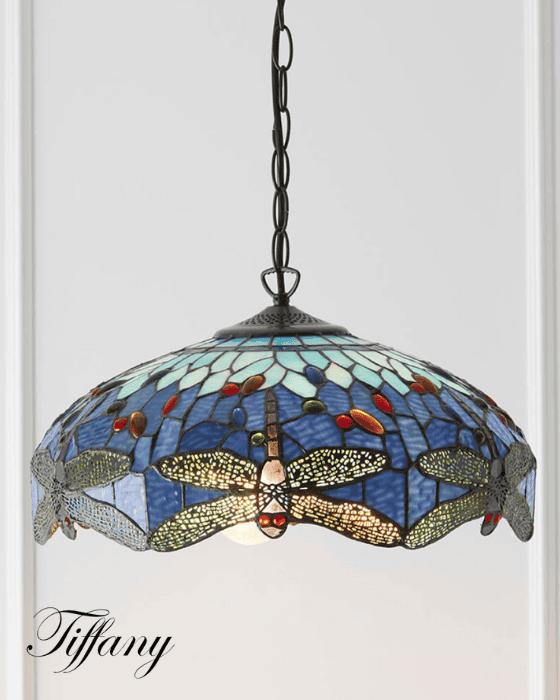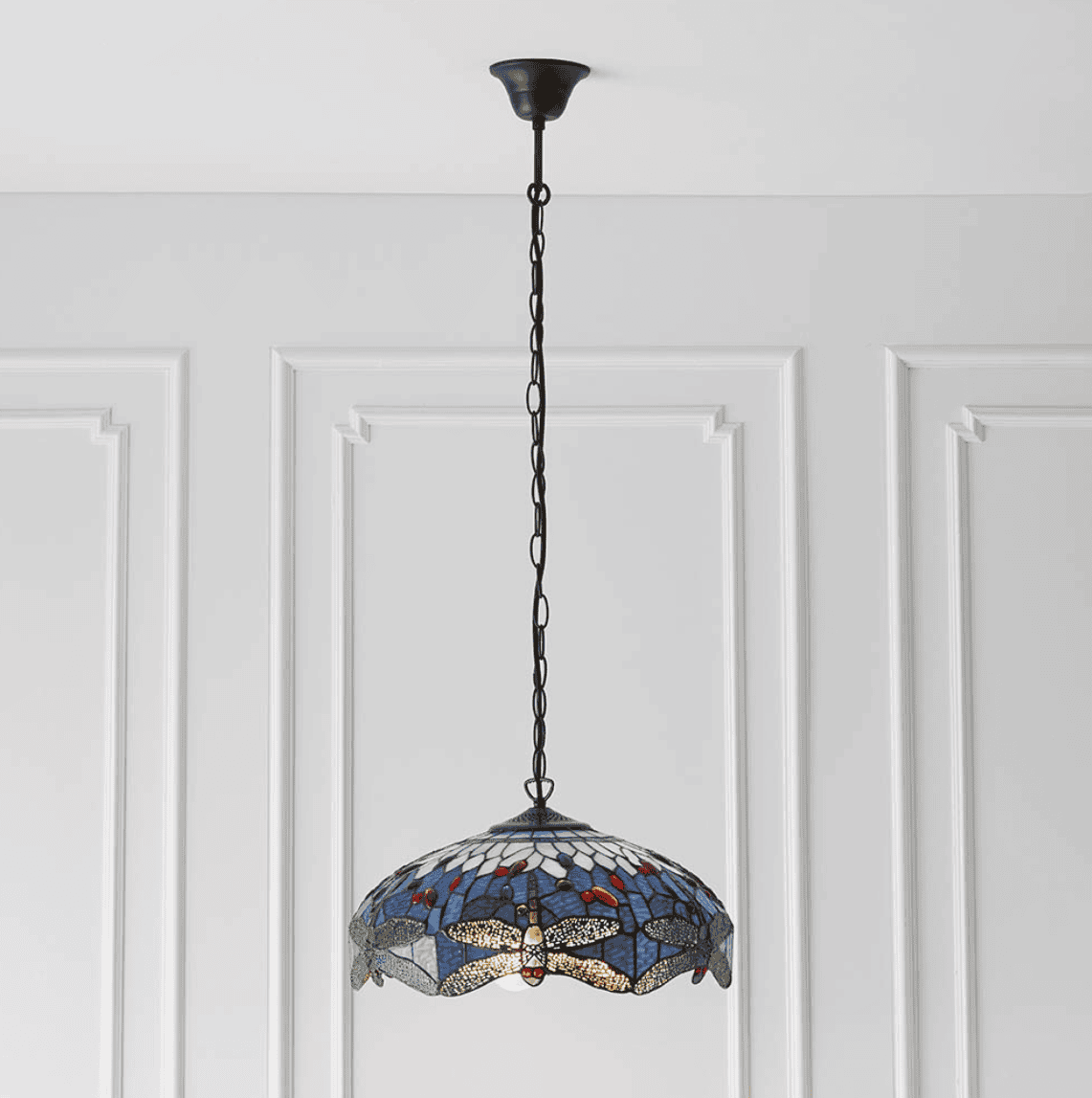 This stunning 3-light pendant showcases the iconic Tiffany Dragonfly design in vibrant shades of blue, accented with multicolored glass beading. Paired with a sleek satin black fitting, it is both dimmable and compatible with LED lamps, combining elegance with functionality.