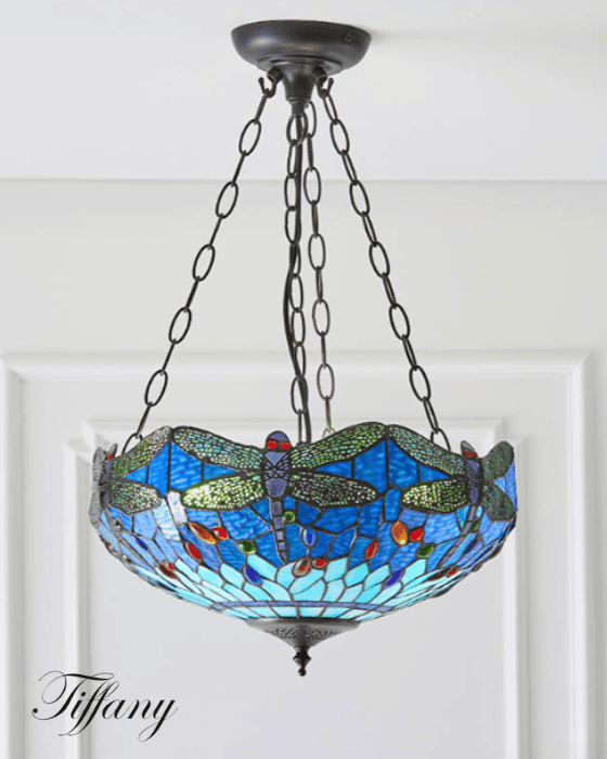 A captivating inverted pendant light featuring the iconic Tiffany Dragonfly motif, rendered in vivid shades of blue and accented with multicoloured glass beading. Paired with a sleek satin black fitting, this piece is both dimmable and LED-compatible, perfect for adding timeless charm and modern functionality to any space.