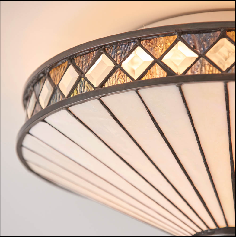 This Tiffany-style wall light features a gracefully understated design, defined by clean lines and a subtle diamond-patterned border. Its timeless charm suits both classic and contemporary interiors. Fully dimmable and LED-compatible, it offers flexible lighting with energy efficiency. Coordinating pieces are available to complete a cohesive and stylish look.