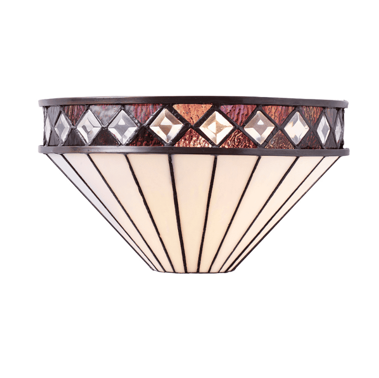 This Tiffany-style wall pendant features an elegantly understated design, highlighted by clean lines and a diamond-shaped border. It is dimmable, compatible with LED lamps, and offers matching items for a perfectly coordinated look.