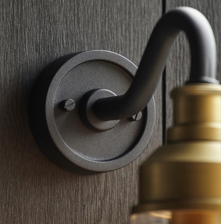 Vesilo Lighting Finesse Antique Brass IP44 Curved Arm Clear Glass Wall Light in die-cast aluminium features a timeless curved arm design, making it an ideal choice for classic, vintage, and modern aesthetics. Its sleek matt black and brushed gold finish adds sophistication and versatility, ensuring it seamlessly fits both exterior settings and bathrooms.